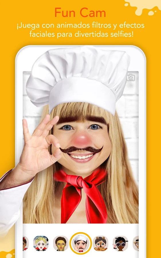 • Efectos de foto que incluye nuevos peinados, caras de animales, disfraces y mucho más.